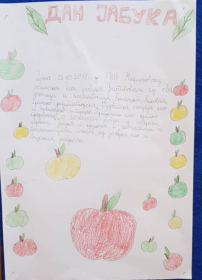 Dana 22. 10. 2018. u PO Makljenovac obilježen je Dan jabuke. Učestvovali su svi učenici i nastavnici. Pripremili su kratko predavanje o važnosti jabuke u ishrani kao i prigodan igrokaz, a zatim su se počastili poslasticama i sokom od jabuka, kao i ukusnim svježim jabukama.