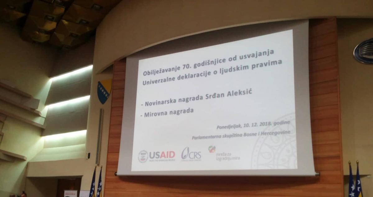Dana 10. decembra 2018. godine u u velikoj sali Parlamenta BiH u Sarajevu održana je svečanost povodom Međunarodnog dana ljudskih prava i sedamdesetogodišnjice od usvajanja Univerzalne deklaracije o ljudskim pravima. Tom prilikom dodijeljene su i Novinarske nagrade Srđan Aleksić, kao i Mirovna nagrada od strane Mreže za izgradnju mira.