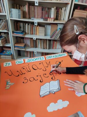 U okviru Dana čitanja, koji su dio ovogodišnje Kampanje „Čitajmo zajedno“, koju već petu godinu organizuje Ministarstvo prosvjete i kulture Republike Srpske, u školskoj biblioteci naše škole danas je održan književni čas sa članovima literarne sekcije. Cilj ove Kampanje je popularizacija književnika, njegovanje kulture čitanja i razvoja čitalačke publike od najranijeg uzrasta. Slogan ovogodišnje Kampanje „Da ne ostanemo bez riječi“ govori o razlogu našeg druženja na času čitanja u školskoj biblioteci.