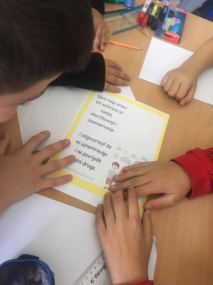 Aktivnosti koje su realizovane prethodne sedmice u našoj školi imaju za cilj afirmisanje drugarstva, različitosti, njegovanje dječijeg stvaralaštva i poštovanje prava svakog djeteta. Kroz realizovane aktivnosti sproveli smo pravo na igru, pravo na ljubav i radost, pravo na prijateljstvo, pravo na obrazovanje, pravo na zaštitu od nasilja i pravo na slobodno izražavanje mišljenja. Na časovima rada u odjeljenskoj zajednici razgovaralo se o dječijim pravima, ali i o obavezama i odgovornostima koje proizilaze iz tih prava. Časovi su organizovani u znaku konstruktivnog dijaloga i slobodnog iznošenja mišljenja. Svoj doprinos u obilježavanju Dječije nedjelje dali su i učenici prvog razreda koji su uz pomoć svojih učiteljica pripremili panoe sa kreativnim porukama o dječijim pravima. Budući da je jedno od dječijih prava i pravo na znanje i obrazovanje, za učenike prvog razreda organizovan je besplatan upis na dječije odjeljenje „Karlo Kolodi“ u Narodnoj biblioteci Doboj. Članovi likovne sekcije osmislili su zanimljive likovne radove na temu „Podijeli radost, znanje, ljubav.“ Ovogodišnji slogan podstakao je učenike drugog razreda da jedni drugima nacrtaju i poklone crteže i balone sa natpisima o ljubavi, radosti, sreći i prijateljstvu. Savjet učenika realizovao je radionicu „Kutija sreće“. Cilj radionice bio je da učenici opišu i slikovito prikažu svoju viziju sreće. Takođe, dobili su zadatak da u svojim odjeljenjima u toku sljedeće sedmice igraju igru „Tajni anđeo“, čiji je cilj da učeniku čije ime izvuku cijele naredne sedmice ostali učenici budu tajni anđeli koji će ga uveseljavati i činiti mu dobra djela. Ovaj značajan datum obilježen je i na časovima srpskog jezika i literarne sekcije pisanjem literarnih radova i raspisivanjem javnog konkursa na nivou škole za najbolji literarni rad. Posebno su se izdvojili stihovi Sare Ilić, učenice sedmog razreda: