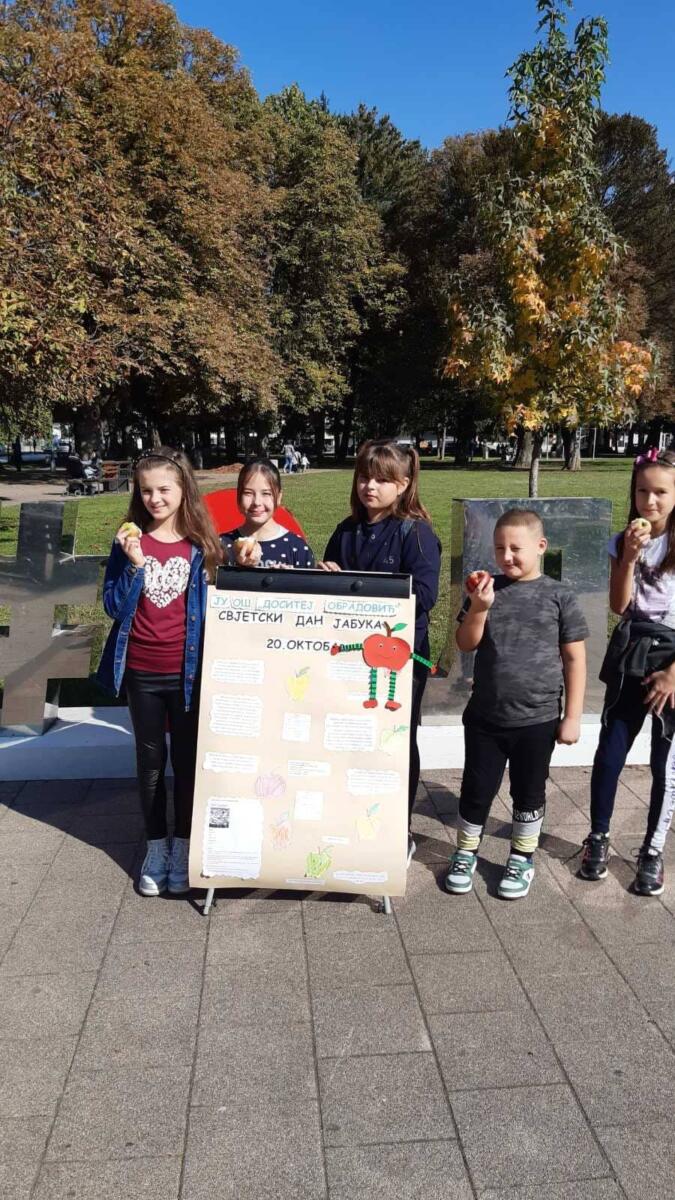 Povodom obilježavanja Svjetskog dana jabuke Savjet učenika u našoj školi juče je realizovao niz aktivnosti: istraživali su o važnosti jabuka u našoj ishrani, pripremili korisne savjete o upotrebi ove zdrave i sočne voćke, te su napisali recept za kolač od jabuka i napravili prigodne ilustracije, panoe i brošure. Nakon toga su prolaznicima u gradskom parku dijelili jabuke, brošure i recept za kolač od jabuka sa ciljem da ukažu našim građanima koliki značaj jabuka ima za zdravlje čovjeka. I naši učenici prvog razreda dali su svoj doprinos u obilježavanju Svjetskog dana jabuka. Oni su sa svojim učiteljicama crtali i bojili drvo sa jabukama. Zatim su organizovali i jednu takmičarsku igru, a na kraju su isjekli jabuke, ukrasili ih šlagom i čokoladnim mrvicama, te se svi zajedno počastili i uživali u mirisu i ukusu ove zdrave i sočne voćke.