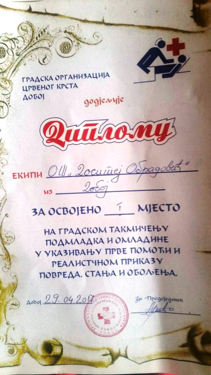 Članovi naše sekcije Crveni krst učestvovali su na gradskom takmičenju podmlatka i omladine u ukazivanju prve pomoći i realističnom prikazu povreda, stanja i oboljenja. Takmičenje je održano u prostorijama Crvenog krsta gdje su učestvovali učenici četiri škole sa područja grada Doboja. Naši učenici osvojili su prvo mjesto.