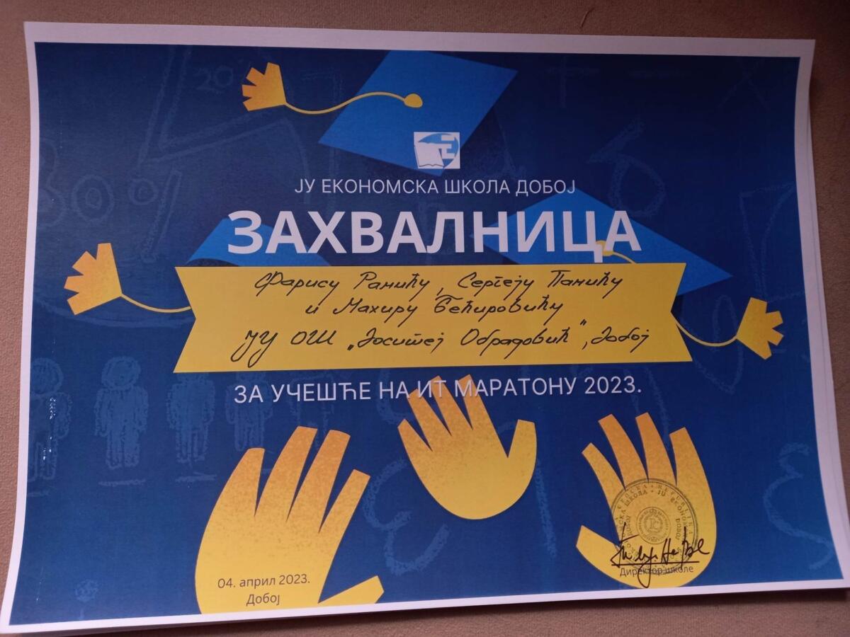 Povodom Dana otvorenih vrata Ekonomska škola u Doboju bila je organizator i domaćin prvog IT maratona – takmičenja za učenike devetog razreda iz oblasti informacione tehnologije. Učešće u ovom takmičenju uzeli su i učenici naše škole. Formirana su dva tima naših učenika. Prvi tim činili su učenici Aleksandar Jovičić, Harun Delić i Denis Huskić i oni su osvojili 13. mjesto. Drugi tim činili su Faris Ramić, Mahir Bećirović i Sergej Panić i oni su osvojili 7. mjesto.