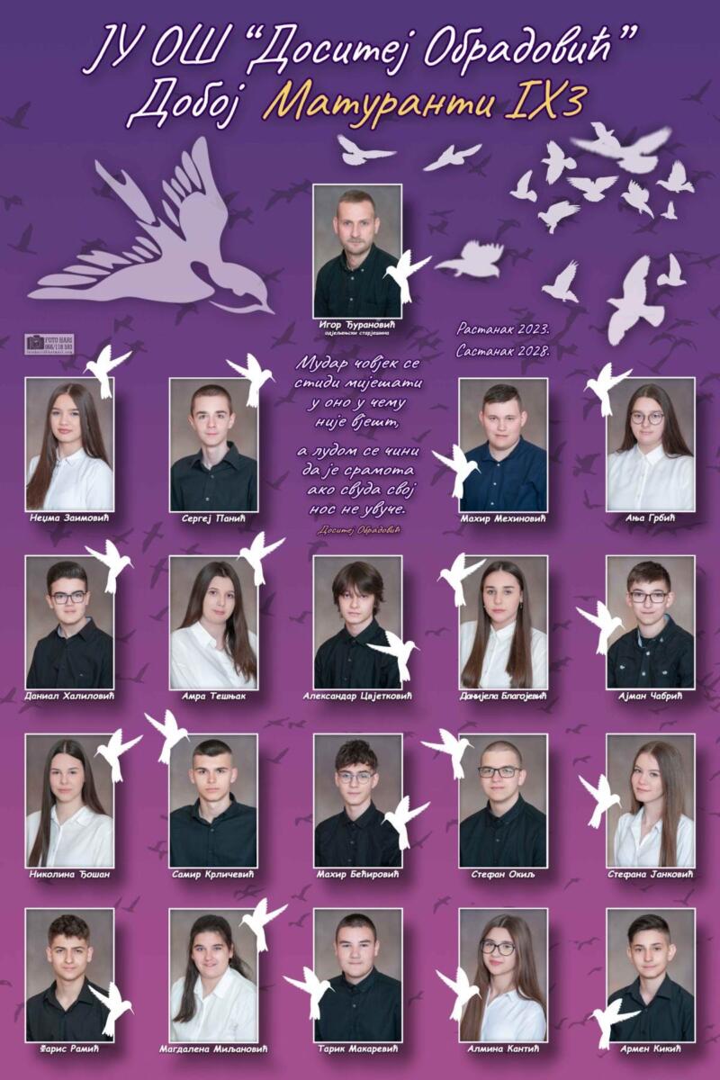 Naši učenici devetog razreda zatvaraju jedna vrata svog životnog puta i polako prave prve korake u svijet odraslih. Odlaze dalje da proširuju svoja znanja i grade svoju budućnost. Dijelićemo radost svih vaših budućih uspjeha i dostignuća, ma gdje bili. Želimo vam sreću i uspjeh na svim poljima i sa radošću išćekujemo novu generaciju, kojoj ćemo sa jednakom revnošću, pažnjom i ljubavlju prenijeti sva svoja znanja.